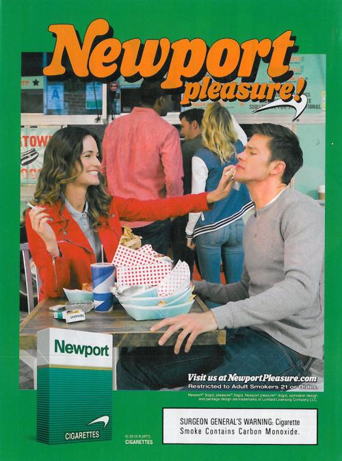 Newport ad featuring a couple eating outside a food truck. The woman is holding a cigarette and there is an open pack on the table.