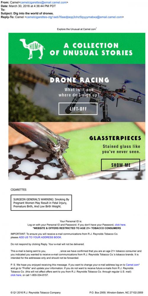 Email from Camel in March 2016 as part of the "Hump Day" series featuring "a collection of unusual stories." Features this week include drone racing and stained glass art.