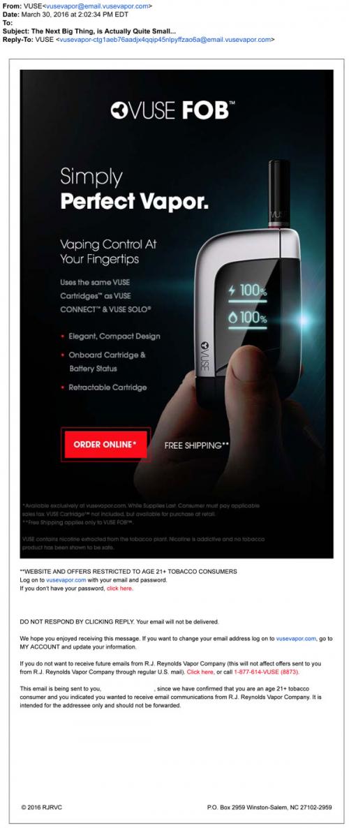 Vuse email from March 2016 promoting their FOB product, available only on the brand website. Emphasizes the portability, ease and small size. Text: "Simply perfect vapor."