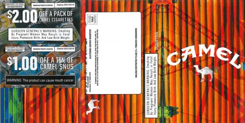 Direct mail from Camel in March 2016 with coupons for cigarettes and snus products. Reminds the recipient to continue to claim monthly coupons on the brand website.