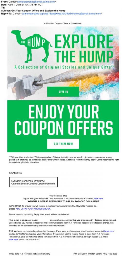 Camel email sent in April 2016 to promote their weekly Hump feature, which features stories and limited free giveaways. Also links to the brand website to claim monthly coupon offers.
