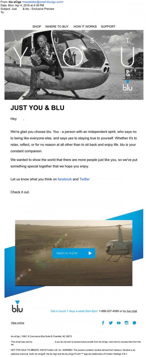 Blu email from April 2016 with a feature about "Just You & Blu," a celebration about the "independent spirit" that enjoys their products. Has a link to a video on the brand website and invites the recipient to share their views on social media.