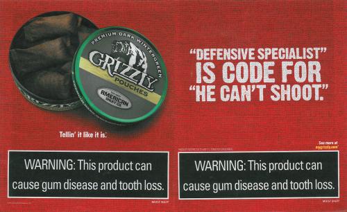 2-page Grizzly ad as part of the "Tellin' it like it is" series has a sports theme. Text: "'Defensive specialist' is code for 'He can't shoot.'"