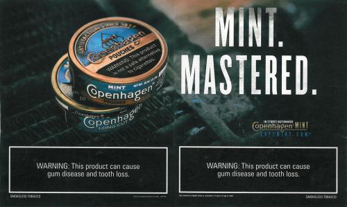 2-page Copenhagen ad promoting their mint smokeless products. Text: "Mint. Mastered."