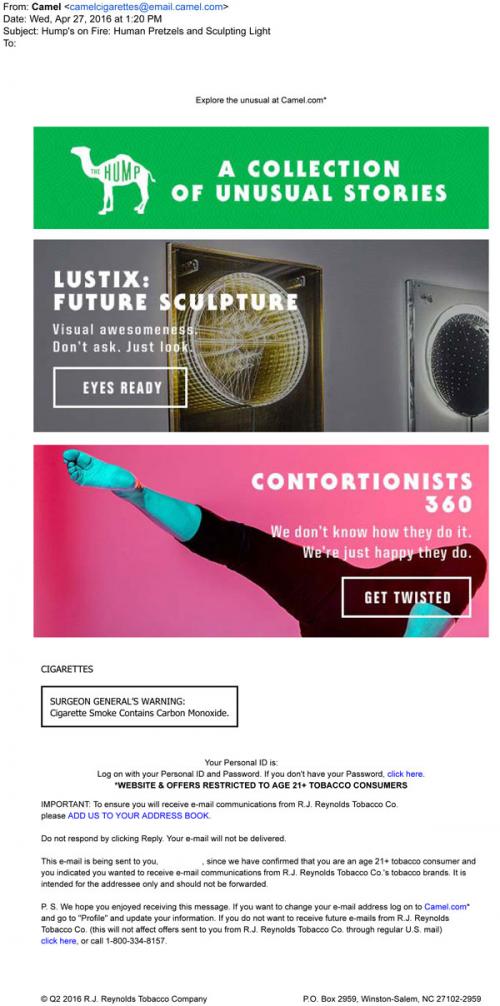 Email from Camel in April 2016 promoting this week's "Hump" featured articles about light sculpture and contortionists, with links to the brand website.