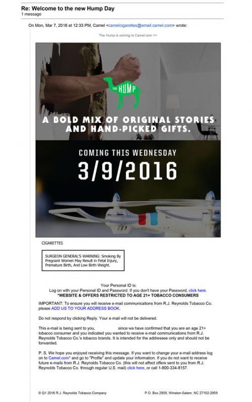 Email received form Camel March 2016 Promoting the new Hump Day experience. Starting Wednesday March, 9, 2016 there will be, "a bold mix of original stories and hand-picked gifts," on the brand website.