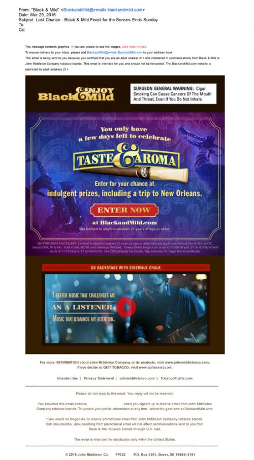 Email received from Black & Mild in March of 2016 reminding receiver there are only a few days left to enter the Feast for the Senses Sweepstakes. Recipients can enter at the brand website to win indulgent prizes including a trip to New Orleans. Email also invites users to, "go backstage with sidewalk chalk" and watch a video on the brand website.