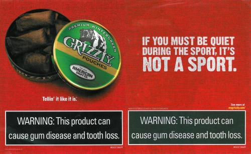 Grizzly 2-page ad from the "Tellin' it like it is" series that features their pouch products. Text: "If you must be quiet during the sport, it's not a sport."