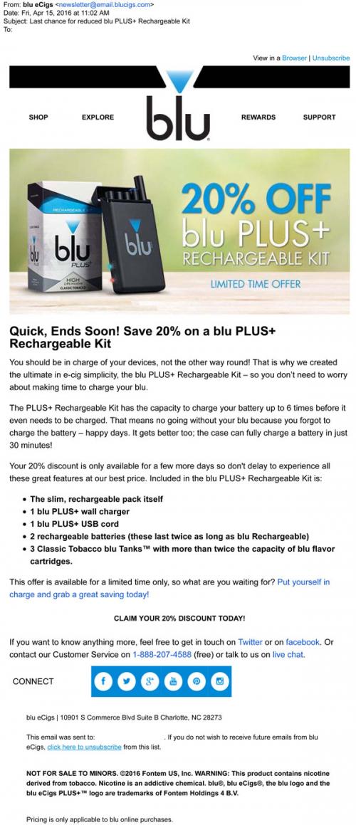 Email from blu in April 2016 reminding the recipient that a 20% discount off blu PLUS+ rechargeable kits on the brand website will only be valid for a few more days.