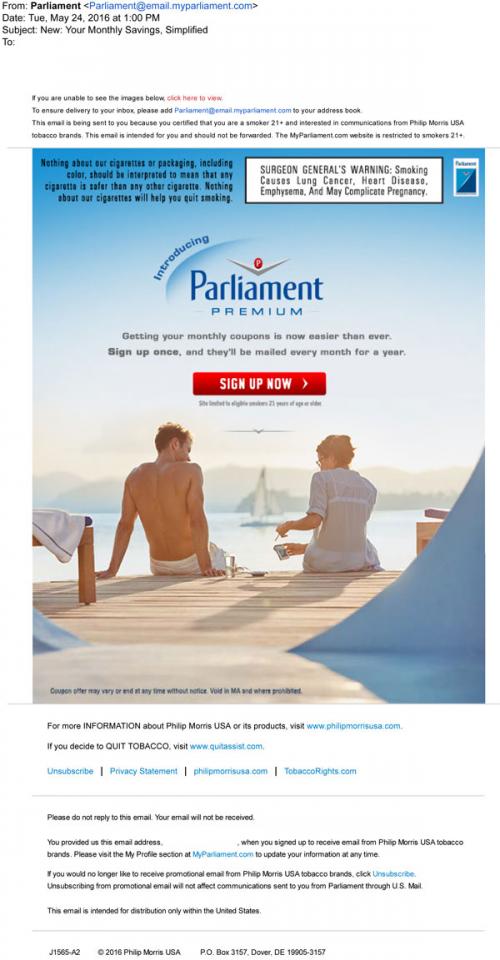 Email from Parliament in May 2016 promoting their new coupon program. Customers can sign up for "Premium" on the brand website to automatically get coupons sent to them each month, instead of having to request coupons monthly.