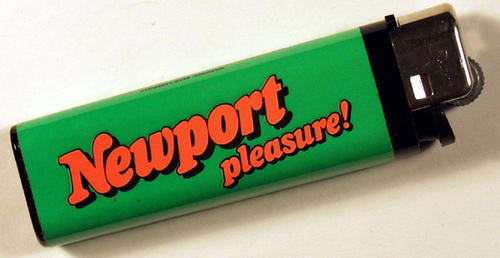 Green bic lighter with orange "Newport pleasure!" on both sides.