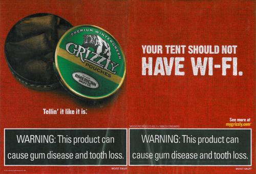 2-page Grizzly ad promoting pouches from their "Tellin' it like it is" series. Text: "Your tent should not have wi-fi."