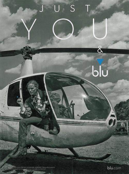 Magazine ad for blu with the slogan "Just you & blu." Shows a woman in a helicopter with an e-cig in her hand.