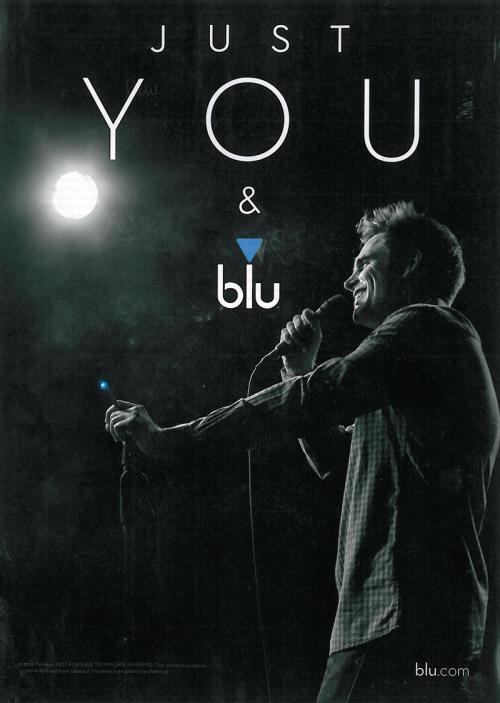 Magazine ad for blu with the slogan "Just you & blu." Image is of a man on stage with a mic and his e-cig, either a musician or comedian or some kind of entertainer.