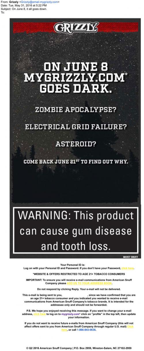 Grizzly email from May 2016 announcing that the brand website will be shut down for a period in June, with an invitation to visit on the day it starts back up.