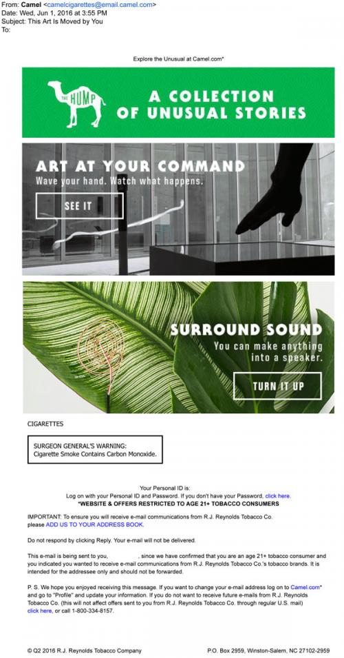 Camel email from June 2016 featuring links to the weekly Hump articles about dynamic art and interesting technology.