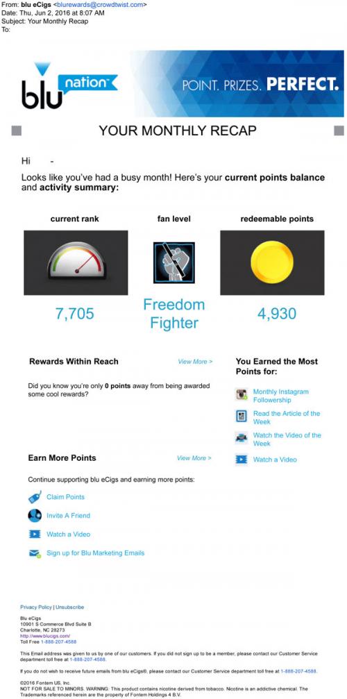Email from blu in June 2016 with a Monthly Recap of current rewards points for the recipient. Email has new customer service information on the bottom.