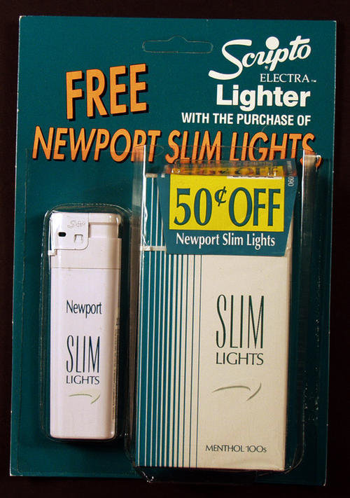 Scripto electra lighter with the purchase of free Newport slim lights. White lighter with green text on side.