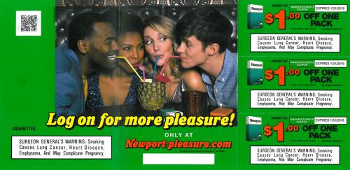 Newport direct mail received in November 2015 delivering coupons. Also promotes the brand website. Has an image of a group of men and women drinking a tropical cocktail.