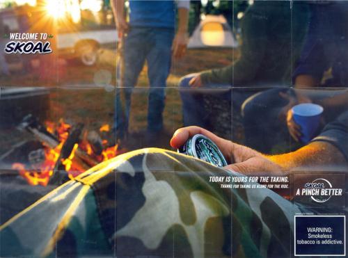 Direct mail from Skoal in June 2016 acting as a welcome piece for a new customer. Unfolds to a giant, two-sided poster with scenes from men at a campsite and a coupon attached. Promotes the brand website for coupons and other entertainment "to make your day more enjoyable." Text: "Today is yours for the taking. Thanks for taking us along for the ride."