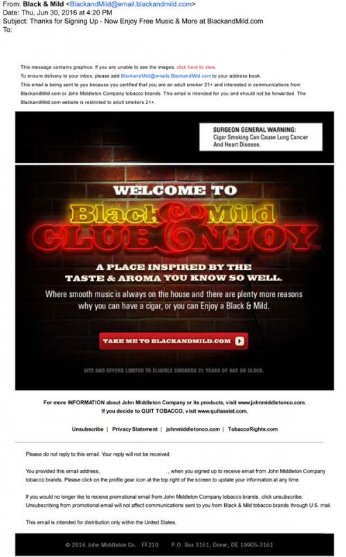 Black & Mild welcome email from June 2016 sent to a new customer. Invites the recipient to the brand website to check out free music and more.