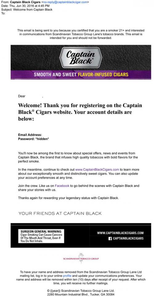 Email from Captain Black in June 2016 welcoming a new customer to the brand website. Also has an invitation to join the brand on Facebook and interact with the brand.
