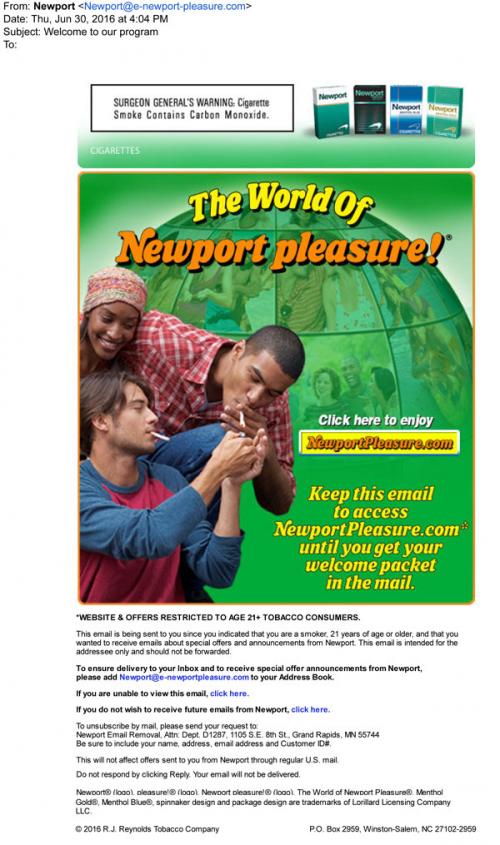 Newport email welcoming a new customer to the brand website in June 2016. The recipient is asked to use the email link to access the site until a welcome packet arrives in the mail.