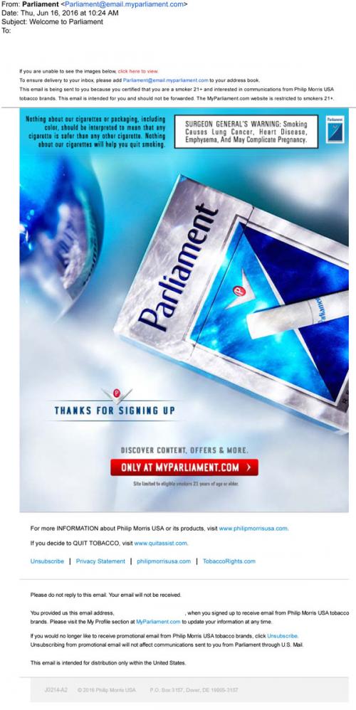 Parliament email from June 2016 welcoming a new customer and thanking them for signing up at the brand website.