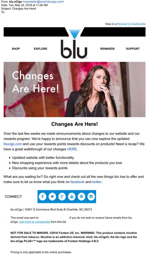 Blu email from May 2016 promoting the newly designed website and rewards program. Members can now use the points they earn by watching videos and interacting with social media as discounts towards purchases of blu products. Encourages visitors to leave feedback on various social media outlets.