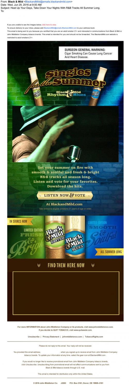 Black & Mild email from June 2016 to promote their limited time products, Rhythm and Blues cigars, for the summer. Invites the recipient to the brand website to listen to free music, vote on favorites, and download the popular ones. Also shows a map with a nearby retail location to purchase.