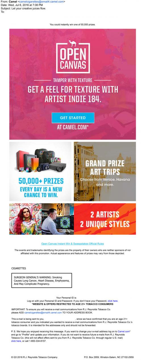 Camel email from July 2016 promoting the Open Canvas sweepstakes with a feature on one of the involved artists. Promotes the grand prizes and instant wins with a link to enter on the brand website.