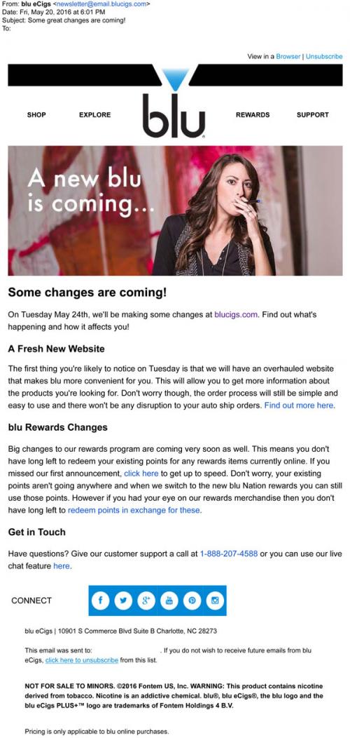 2016 announcing changes coming to the brand website and rewards program. Members will be able to use rewards points as discounts towards purchases of blu products, instead of in exchange for blu merchandise. Encourages
