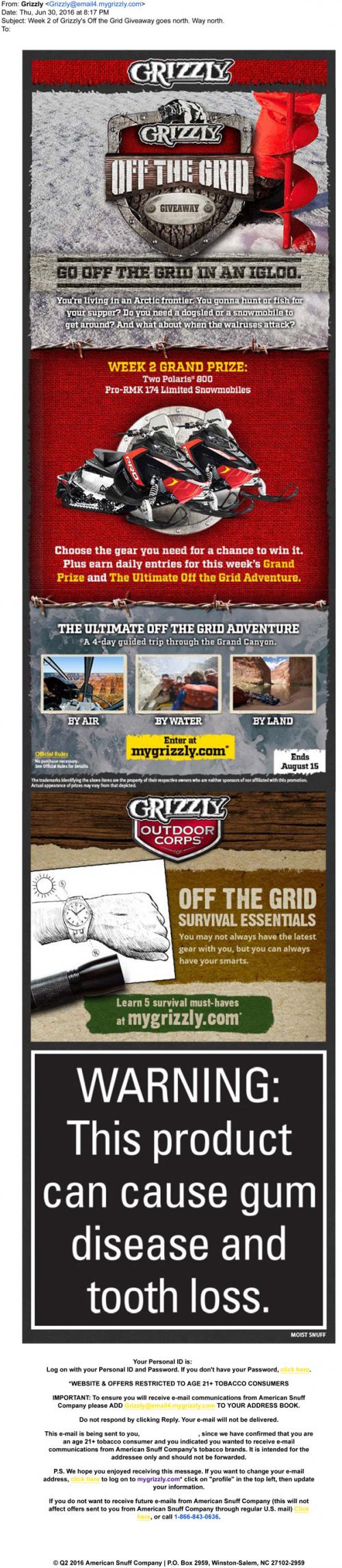 Grizzly email from June 2016 to promote the second week of the Off the Grid giveaway, with an Arctic theme. Invites the recipient to the brand website to enter. Also includes the Outdoor Corps feature about survival essentials.