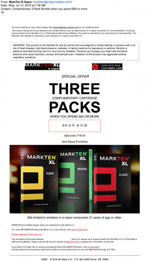 Email from MarkTen in July 2016 with a promotional offer for three free cartridge packs with a 60$ purchase made on the brand website.