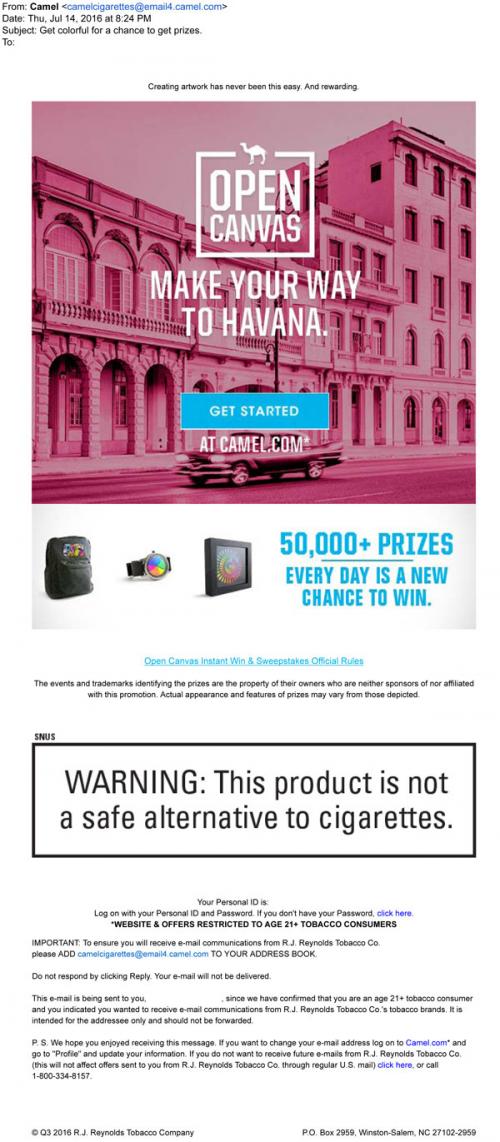 Camel email from July 2016 promoting the Open Canvas sweepstakes and prizes. Links to the brand website to enter.