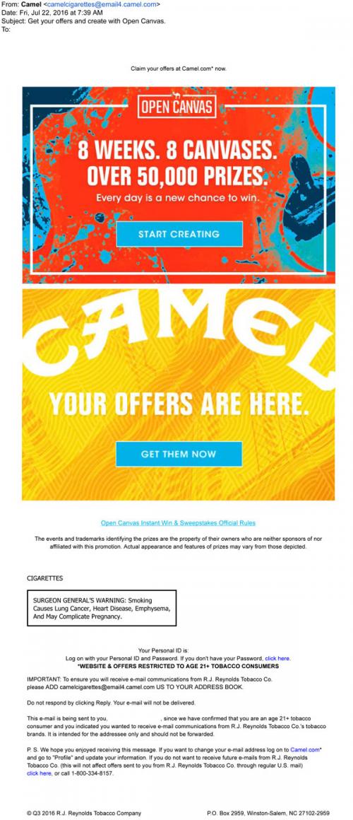 Camel email from July 2016 promoting the Open Canvas sweepstakes, with a link to the brand website to enter. Also links to claim coupon offers.