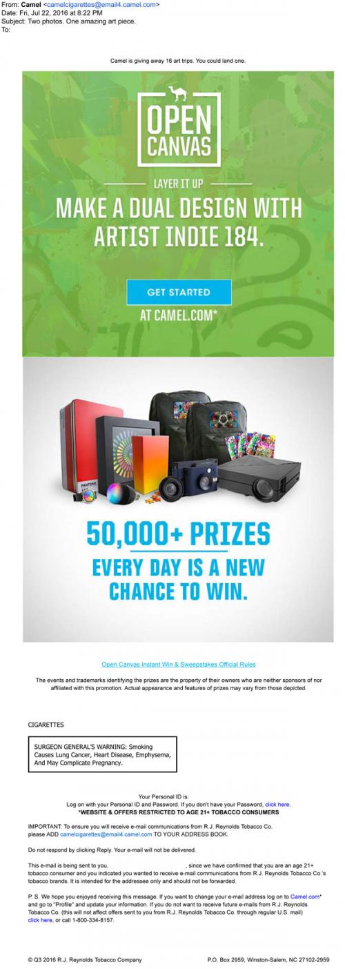 Camel email from July 2016 promoting the Open Canvas contest with an invitation to participate in making art on the brand website with one of the featured artists. Also includes a link for the chance to enter and win.