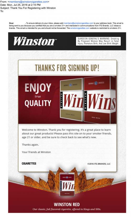 Email from Winston in July 2016 thanking the recipient for registering at the brand website. It makes the suggestion of sharing the site with "your smoker friends" and reminds the reader to check back periodically to see what's new.