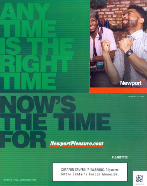 Newport direct mail from July 2016 containing coupons. Promotes the brand website as a place to see more promotions, participate in activities and enjoy their other offers. Text: "Any time is the right time. Time for friends. Time for pleasure. Time for more. Now's the right time for NewportPleasure.com."