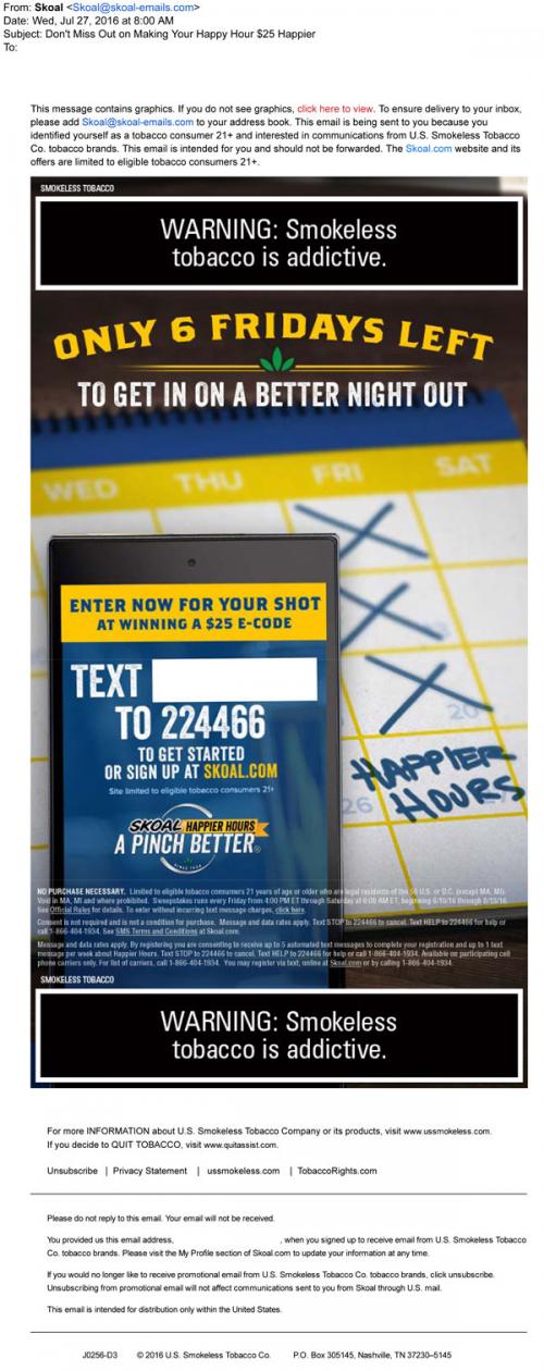 Email from Skoal in July 2016 with a reminder to enter the Happier Hours giveaway, where participants can win 25$ every Friday. Includes instructions on how to enter via mobile phone or through the brand website.