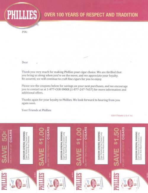 Direct mail from Phillies cigars in April 2016 delivering coupons and thanking the recipient for their loyalty.