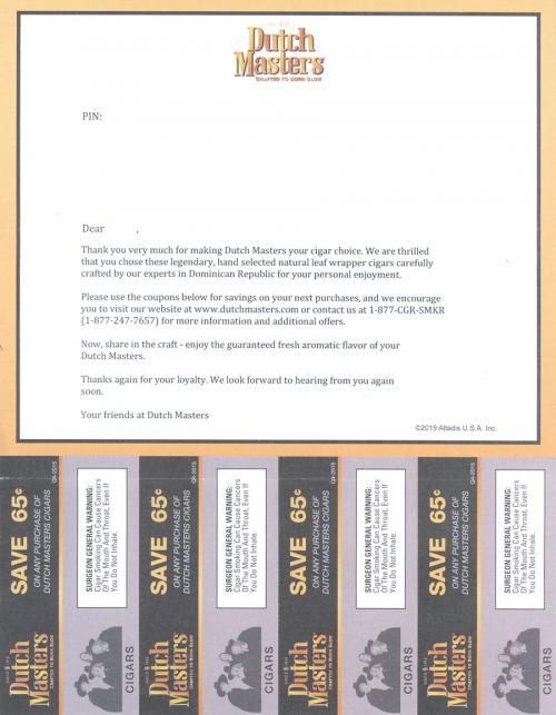 Direct mail from Dutch Masters cigars in April 2016 containing coupons and thanking the recipient for their loyalty.