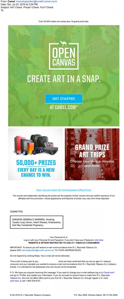 Camel email from July 2016 promoting the Open Canvas sweepstakes. The recipient is invited to the brand website to create art for the chance to win. Art prizes and trips are highlighted, as well as the opportunity for daily entries.