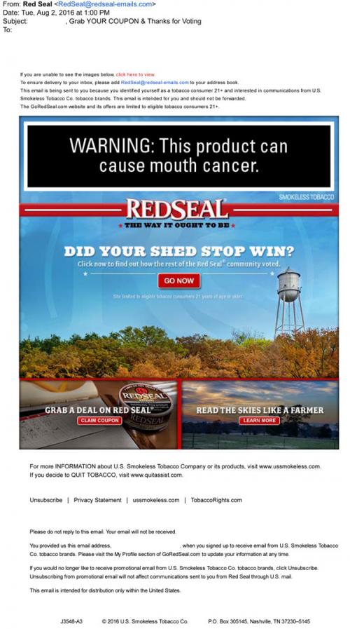 Red Seal email from August 2016 linking to the results of the shed stop vote on the brand website. Participants voted on where the brand marketing shed would visit. Also links to claim monthly coupons and learn how to predict weather by looking at the sky, like a farmer.