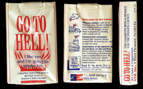 "Go To Hell" cigarette pack. "I like 'em and I'm going to smoke 'em. Cheaper than psychiatry, better than a nervous breakdown." Surgeon General's warning: smoking causes lung cancer, heart disease, emphysema, and may complicate pregnancy. GTH Inc. Point Pleasant, NJ