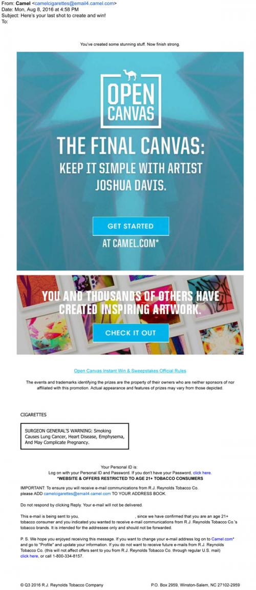 Camel email from August 2016 promoting the final chance to participate in the Open Canvas sweepstakes. Links to the brand website to participate in making art with one of the featured artists and to see a gallery of other entrants' artwork.
