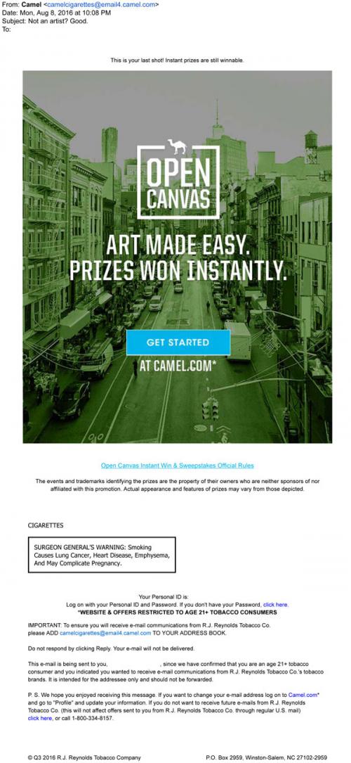 Email from Camel in August 2016 promoting the Open Canvas sweepstakes, with the chance to win prizes after making an artistic entry on the brand website.