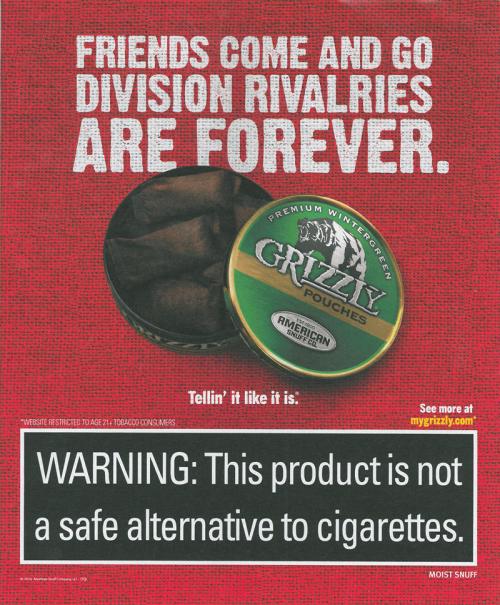 Grizzly ad from the "Tellin' it like it is" series with an emphasis on their pouch products. Text: "Friends come and go, division rivalries are forever."