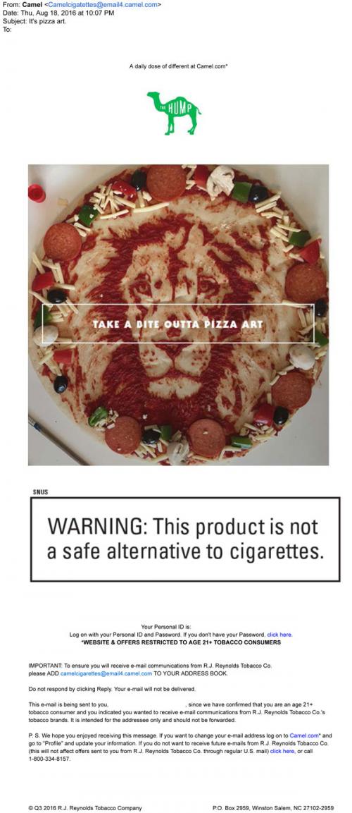 August 2016 email from Camel promoting their Hump Day weekly article; this one is about "pizza art". Provides a link to the brand website.