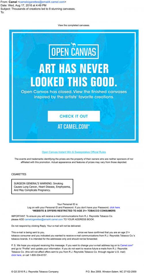 Camel email announcing the end of the Open Canvas contest in August 2016 with an invitation to view the finished creations on the brand website.